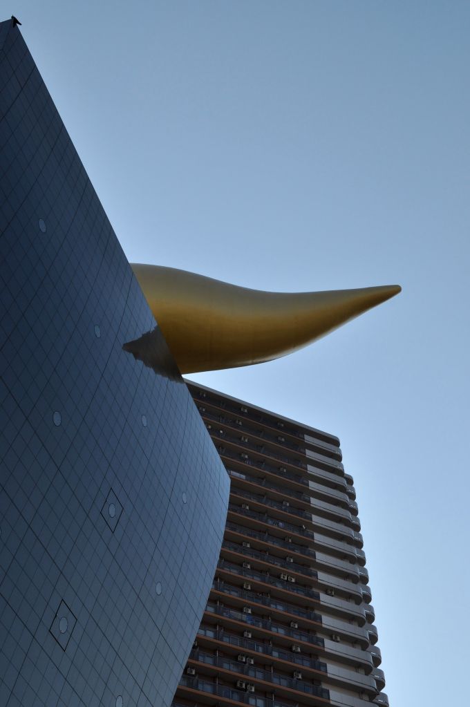 Çatıdaki obje sapsarı renkte olgunlaşmış ve köpüklenmiş bira mayasını temsil ediyormuş. Siyah bina da bardağı. Bana sorarlarsa (ki sormazlar) halk arasında yerleşmiş tanımı orjinal. Objenin dış görünüşüne ve fiziksel özelliklerine uyuyor. Tokyo’da farklı sınıfların birbirine belki de en yakınlaştıkları Asakusa’nın otantik yapısı ile de ahenk içinde. Sözde ve görünüşte var olmayan, ama bilinçaltına yerleştiği her bireyin her daim farkında olduğu “sınıfsal ayrılıkları” bundan daha çarpıcı, kaba ve asi bir yol ve biçimle anlatmak da mümkün olamazdı herhalde. Kimbilir belki de mimar bölgenin tarihsel gelişimini ve özelliklerini öğrenince kendince bir muziplik yapmak istemiştir.