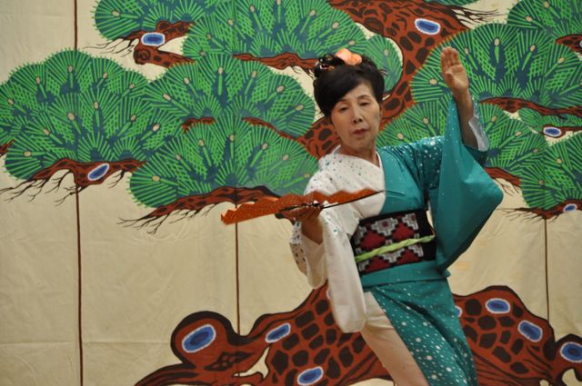 Kendini ortama kaptırmış ve yeniden geçmişe dönmüş bir teyze kimonosu ile geleneksel bir dansı icra ederken