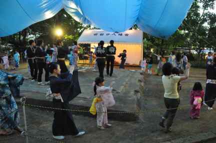 Binbir çeşit ses birbirine karışıyor çevremizde. İki üç ayrı yerden müzik, hoparlörleri patlatırcasına gürültüyü bastırmaya çalışıyor gibi. Uzaklardan davul ve tef seslerine karışan zil duyuyor gibi oluyorum. Bir yerlerden kalabalık bir grup dans ederek geleneksel fener alayı yürüyüşünü yapıyorlar gibi. Beri köşede bir “Noh” tiyatrosu bu asil Japon sanatını icra ediyor. Onun tam karşısında kimonolu hanımlar ve beyler ya geleneksel bir dans gösterisi yapıyorlar, ya da karaoke, yani şarkı söylüyorlar. Meydanda boş yok.