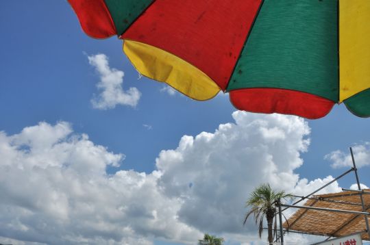 Mavi gök, beyaz bulut, rengarek şemsiye ve salaş çardak